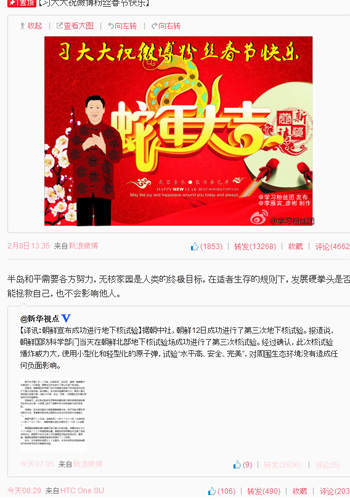 2月12日发出的新贴子似乎是在评论朝鲜刚刚进行的核试验:半岛和平需要各方努力,无核家园是人类的终极目标,在适者生存的规则下,发展硬拳头是否能拯救自己,也不会影响他人。