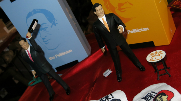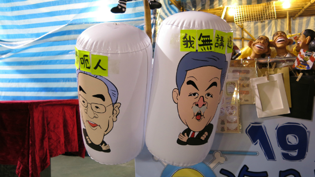 今年的许多产品都以去年的行政长官选举作为主题。这一对人物模型模仿的是落选的唐英年(左)和当选的梁振英。