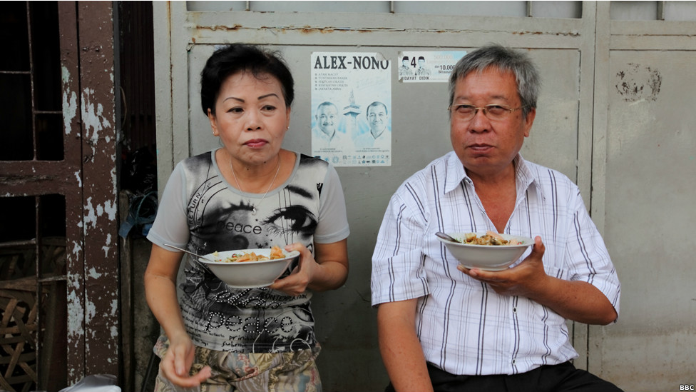 在离开金德院不远处的一个小摊前,记者遇到一对华人夫妇正在吃午餐。他们生在印尼长在印尼,并不会说华语。他们希望新年平安顺利。