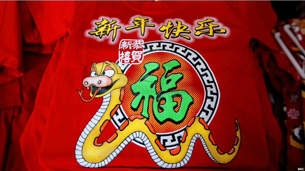 街头小摊上有各种年货售卖,包括印有“新年快乐”圆领衫。