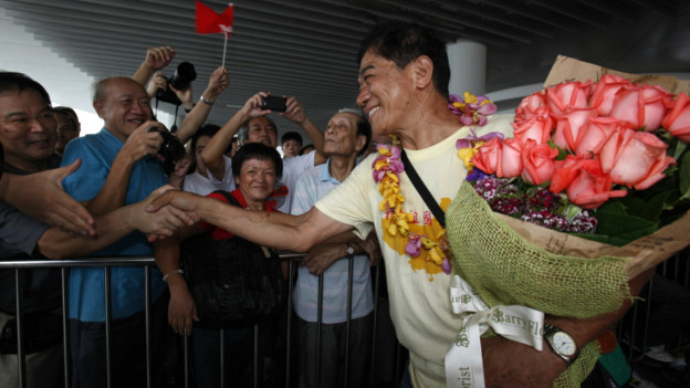香港團體「保釣行動委員會」在碼頭舉行歡迎儀式,稍早時己返回香港的5名保釣人士及家屬均在場迎接。