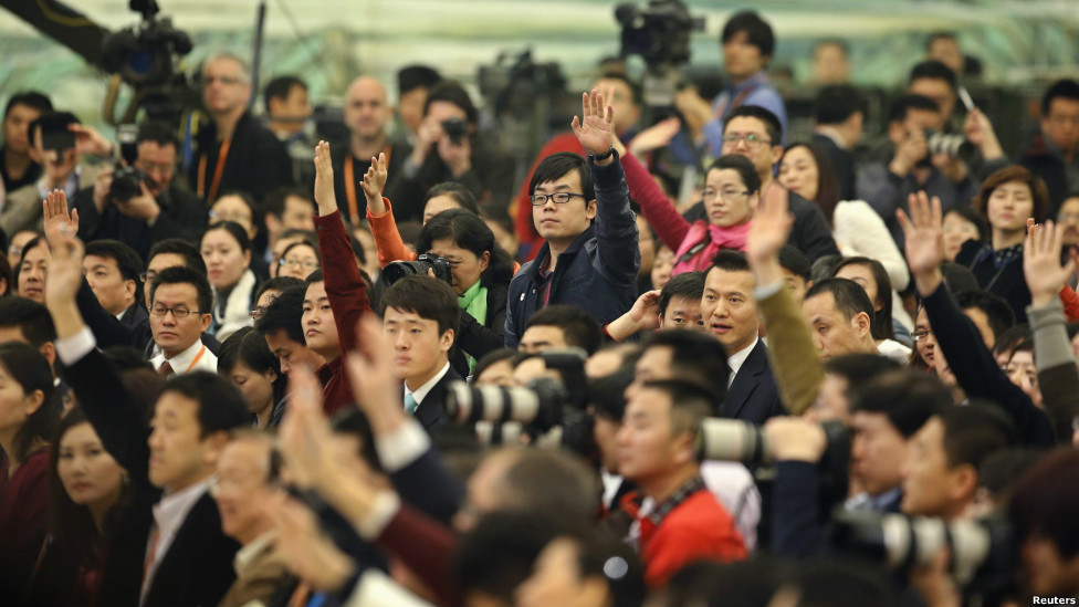 出席記者會的中外媒體記者爭相舉手,希望得到向李克強提問的機會。